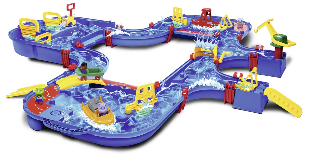 Incluye el enorme circuito acuático con bomba de agua manual, dársena portuaria con grúa, manivela con gran zona de remos, puente pequeño, rampa de acceso, transbordador, barco contenedor con carga, vehículo anfibio y figuras de juego Lotta, Wilma, Nils y Bo.