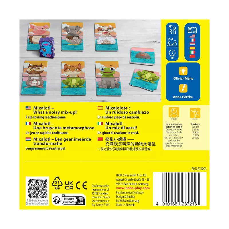 Contiene: 1 figura de ajolote, 20 fichas (10 de cabeza y 10 de cuerpo), 24 cartas (12 de piedras y 12 de nubes) e 1 instrucciones del juego.