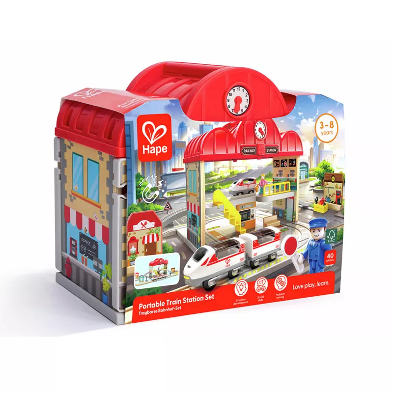 Gracias a su resistente asa y su práctica caja con forma de maletín, puede transportarlo fácilmente a la casa de amigos, a excursiones familiares o donde uno quiera. Además, la caja se transforma en una divertida estación donde montar su propio circuito. Con trenes, vías, personajes y numerosos accesorios, los niños pueden inventar historias sin fin y crear distintos paisajes y escenarios, especialmente si combinan este set con otros juguetes ferroviarios Hape para ampliar la diversión.
