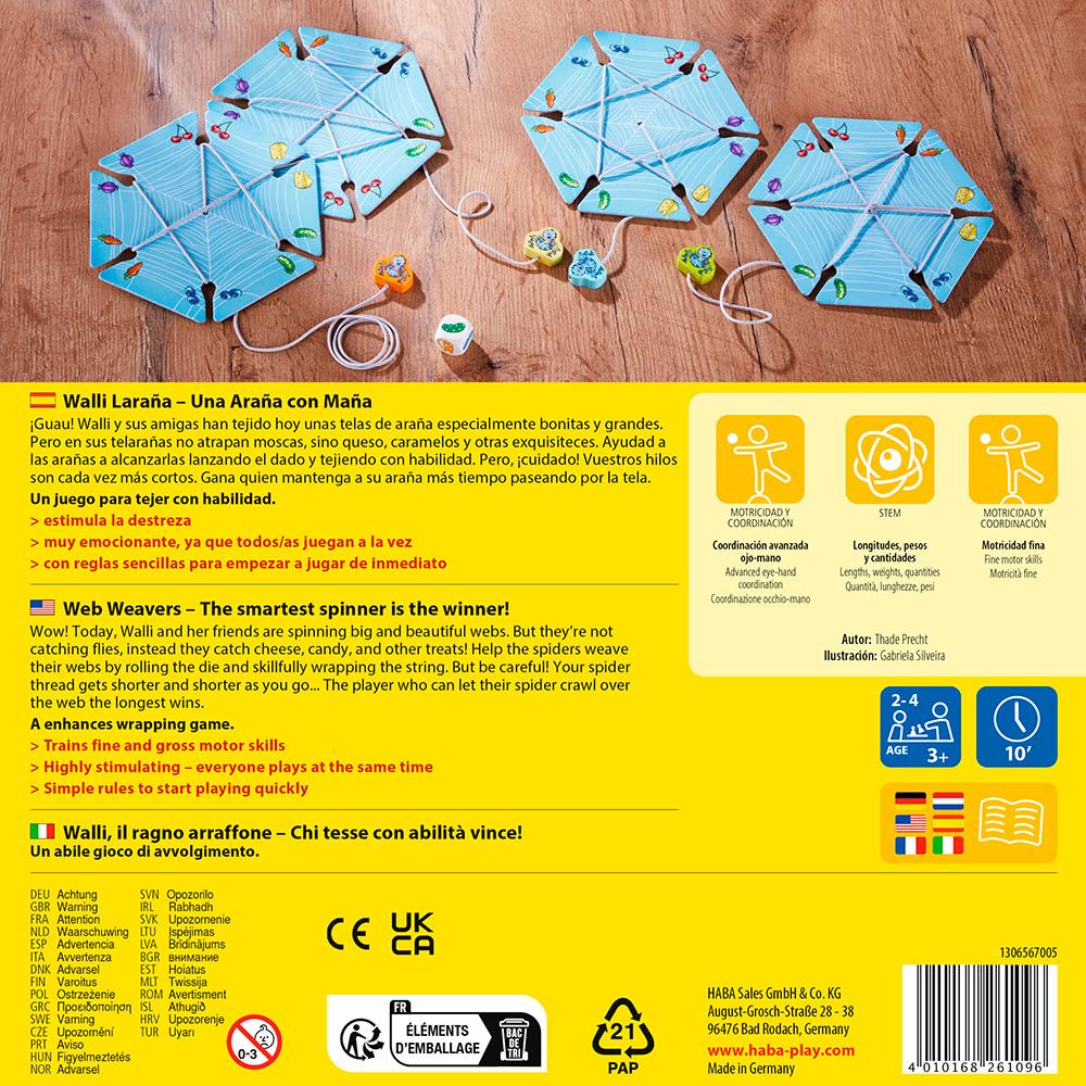 Ayudad a las arañas a alcanzar las exquisiteces lanzando el dado y tejiendo con habilidad. Pero, ¡cuidado!, vuestros hilos son cada vez más cortos. Gana quién mantenga a su araña más tiempo paseando por la tela. La emoción está servida, ya que jugaréis todos a la vez, ¿qué araña será más rápida?