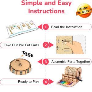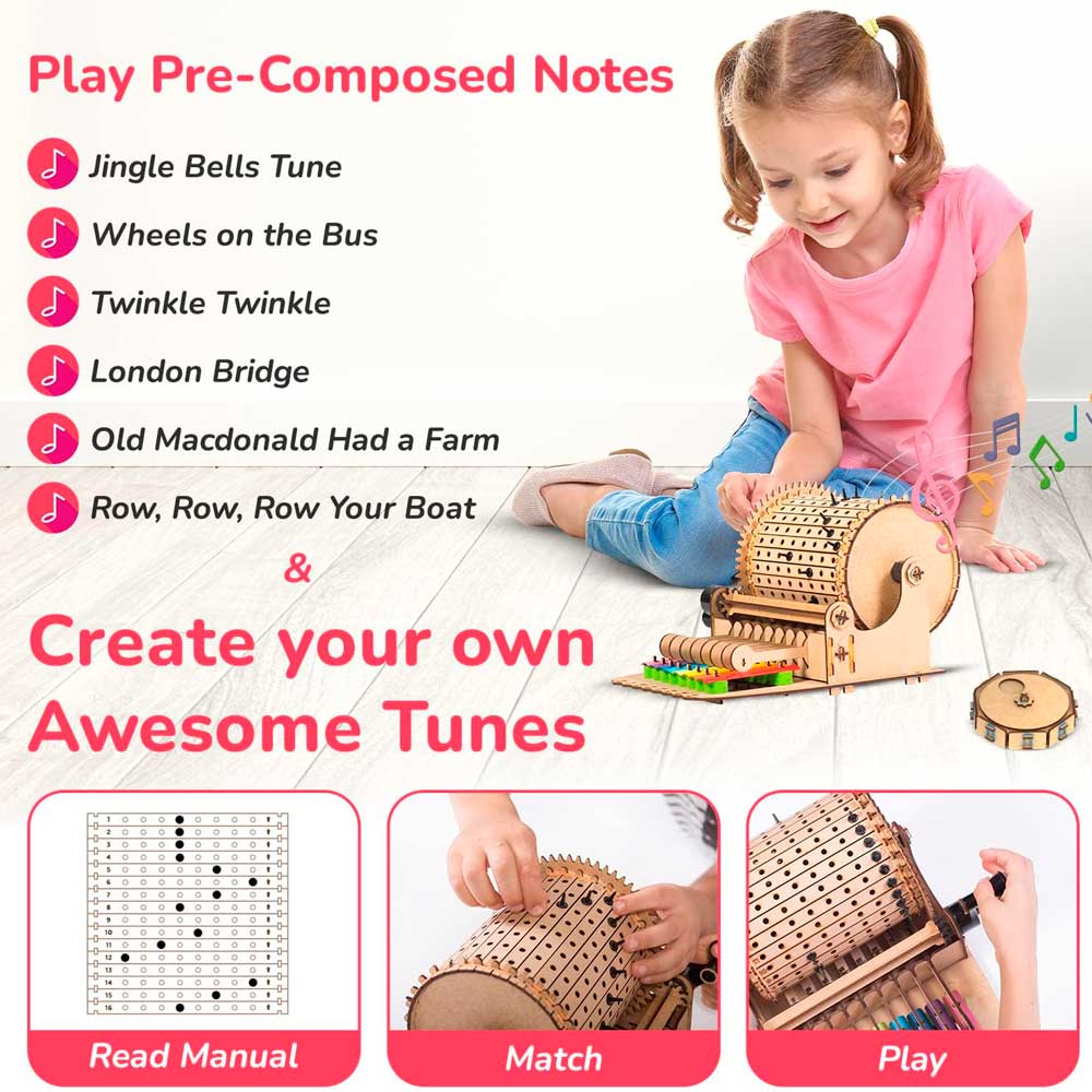 Un kit basados en conceptos STEM, sin pegamento, sin herramientas, con mecanismos de unión para diseñar divertidas melodías. Estructura de montaje modular para ayudar a la construcción a tu propio ritmo. Fácil de montar, desmontar y volver a montar con los manuales de instrucciones y videos aptos para la edad.